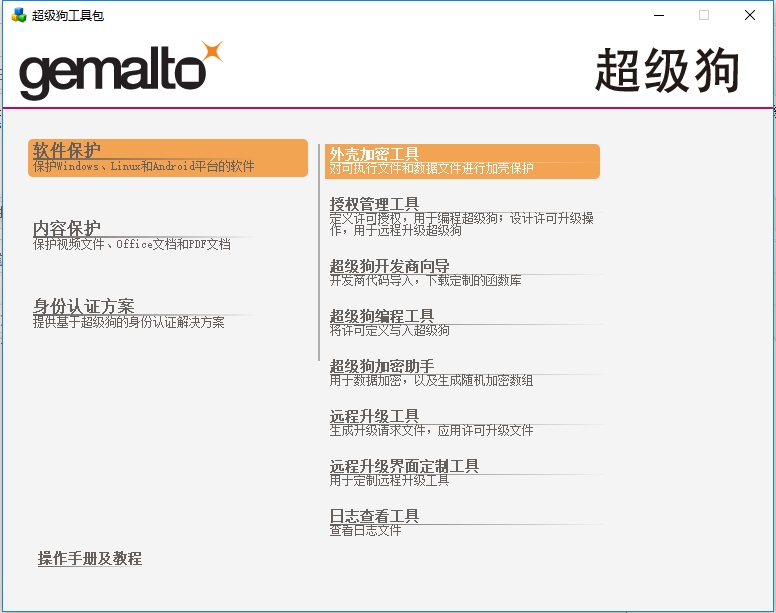 賽孚耐(金雅拓)超級狗是一款功能強大,加密強度高,操作簡單的加密狗,尤其是外殼加密工具,它除了能對普通windows程序加密外,還可以加密安卓程序,通過數(shù)據(jù)加密方式加密視頻、文檔、Flash等多媒體文件,以及AppOnChip方式實現(xiàn)程序代碼在加密狗中運行。