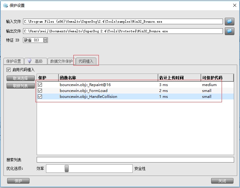 將被加密程序和map文件放同一目錄,加密時在“代碼植入”選項中選擇可以支持在加密狗中運行的代碼。該部分代碼在加密后不會直接在電腦中運行,而是通過加密狗運行并向程序返回運行結(jié)果。哪些代碼可以在加密狗中運行由加密工具自動判斷,函數(shù)代碼太短可能無法被加密工具識別,太長可能會影響運行效率,具體根據(jù)實際程序代碼情況需要多次測試。使用代碼植入功能需要包含map文件,點擊此處查看如何生成map文件->>>>>>>