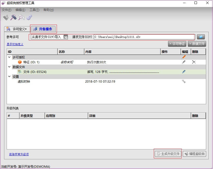 在升級(jí)操作界面,將用戶端傳來的c2v文件導(dǎo)入,導(dǎo)入后會(huì)看到界面中有關(guān)用戶端超級(jí)狗的詳細(xì)信息,對(duì)這些信息加以修改,如增加使用次數(shù)、延長到期時(shí)間、修改存儲(chǔ)區(qū)數(shù)據(jù)等,全部設(shè)置完畢后,點(diǎn)擊“生成升級(jí)文件”,會(huì)產(chǎn)生一個(gè)擴(kuò)展名為v2c的升級(jí)激活文件,將此文件發(fā)給用戶。