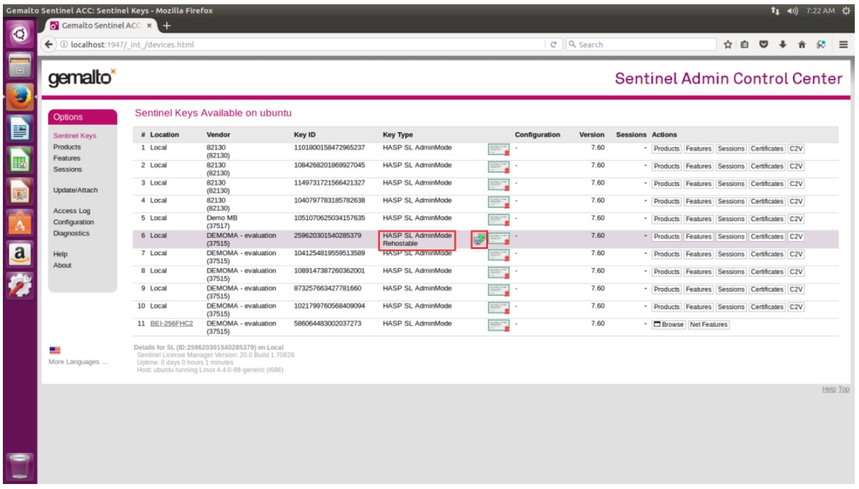 SL能夠?qū)崿F(xiàn) Rehost 的前提條件是 SL本身是可遷移的,也就是 Rehostable 的??梢赃M(jìn)入 A 電腦上打開(kāi) ACC(瀏覽器打開(kāi) http://localhost:1947,點(diǎn)擊 Sentinel Keys 查看 SL的狀態(tài)),如下邊截圖所示紅色框?qū)?yīng)的這個(gè) SL就是 Rehostable的,可以遷移,其它SL都不可遷移。如果想遷移其它 SL,就必須將 SL升級(jí)為具備 Rehostable 屬性。 具體請(qǐng)看下邊的步驟二。