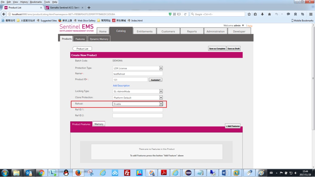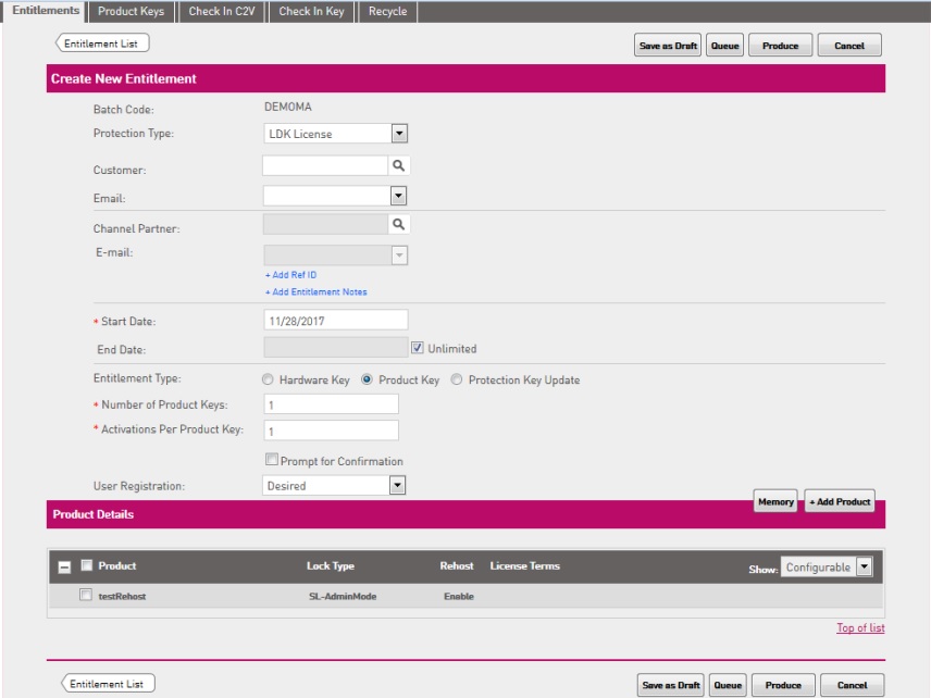 (c、 )去 EMS 里邊Entitlement 標(biāo)簽頁(yè)下,像正常升級(jí)加密鎖一樣的標(biāo)準(zhǔn)步驟進(jìn)行操作。新建 Entitlement,然后Entitlement type選擇中間的Product Key,添加上剛才定義的產(chǎn)品testRehost,然后點(diǎn)擊 Produce,接著 Activate。