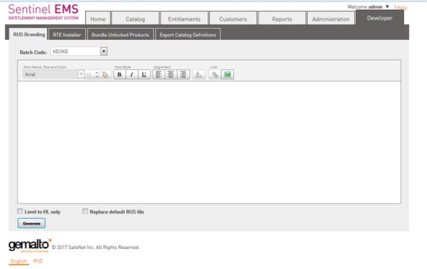 去開(kāi)發(fā)電腦上打開(kāi) EMS,進(jìn)入 Developer 標(biāo)簽頁(yè),可以看到RUS Branding標(biāo)簽頁(yè), BatchCode選擇你的正式號(hào)(比如截圖中的 KEOKE),插上主鎖,點(diǎn)擊左下角的 Generate,就可以產(chǎn)生正式號(hào)對(duì)應(yīng)的 RUS 遠(yuǎn)程升級(jí)工具。