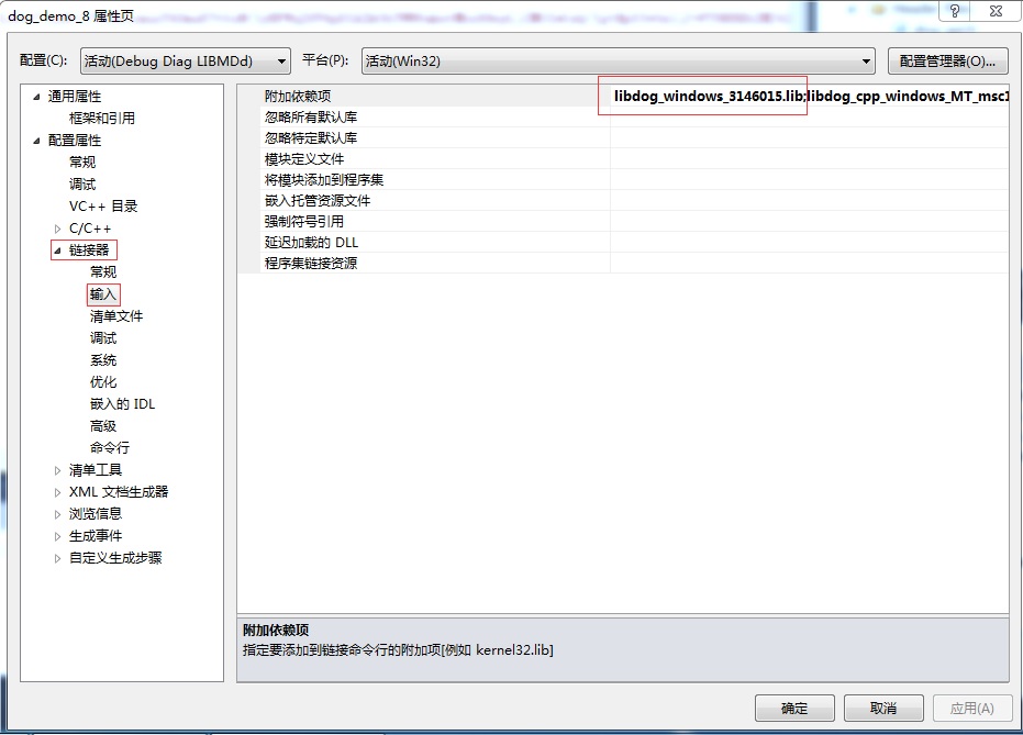 用記事本打開正式號(hào)密鑰文件xxxxx.hvc,把內(nèi)容全部復(fù)制,找到示例目錄中的vendor_code.h文件,把hvc文件中的內(nèi)容替換到“unsigned char vendorCode[] =”后面的引號(hào)中,然后點(diǎn)擊“項(xiàng)目”-“屬性”,在"Link"的輸入項(xiàng)中添加依賴庫(kù)libdog_windows_x64_xxxxx.lib,并把原來的依賴庫(kù)libdog_windows_x64_demo.lib刪除,然后重新編譯生成即可。注意這個(gè)libdog_windows_x64_xxxxx.lib庫(kù)應(yīng)拷貝至工程文件所設(shè)置的依賴庫(kù)目錄列表中。