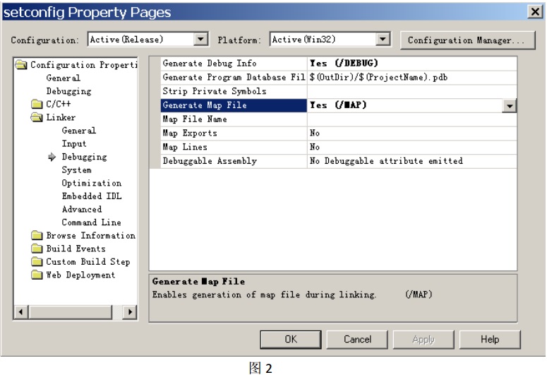 使用 Microsoft Visual Studio .NET 2003, 或 Microsoft Visual Studio(版本號為 2005,2008, 或 2010)其中任意一個編輯器打開一個已有的 Microsoft Visual C++工程,在菜單欄中選擇: Project——Properties,這將打開工程的 Property Pages 對話框, 請選擇Configuration Properties——Linker——Debugging,在選項 Generate Map File 處選擇:“Yes(/MAP)” (如圖 2) ,點擊確定按鈕, 然后重新編譯整個工程, map 文件將與 exe 文件生成到同一目錄中。