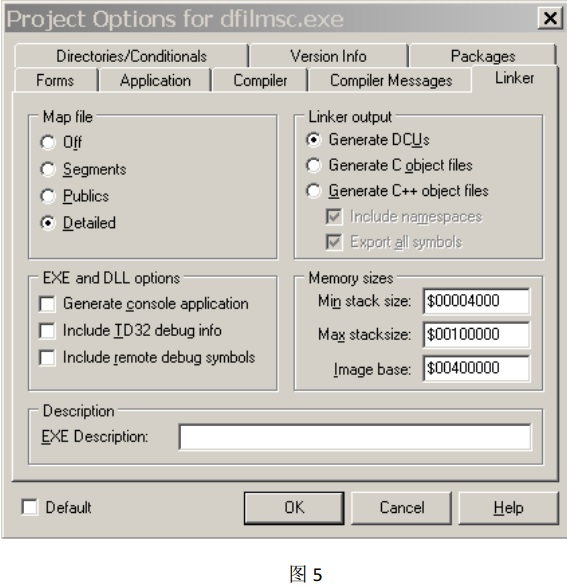 使用 Borland Delphi 7 打開一個已有的 Delphi 工程,在菜單欄中選擇: Project——Options,這將打開工程的 Project Options 對話框, 請選擇 Linker 選項卡,在 Map file 分組框中選擇選項:“Detailed” (如圖 5),點擊確定按鈕,然后重新編譯整個工程, map 文件將與 exe 文件生成到同一目錄中。