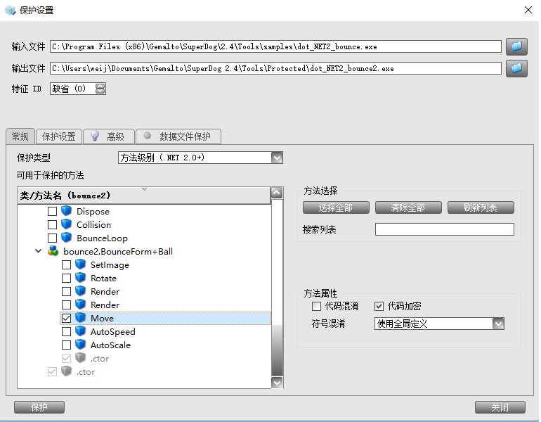 3、用超級狗外殼工具對此demo程序進(jìn)行外殼加密,加密時(shí)選擇對move()做代碼加密。