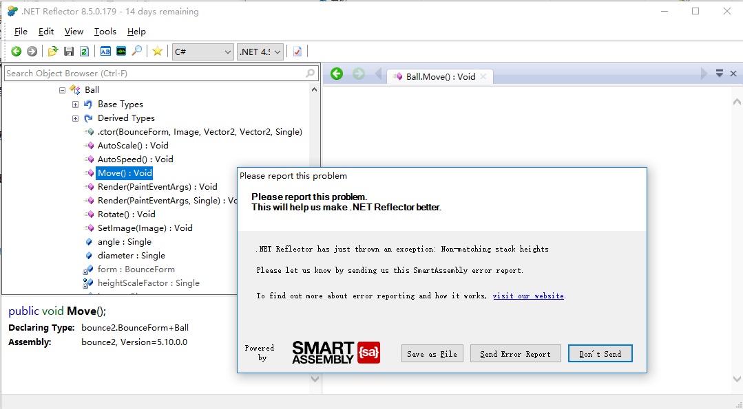 把dot_NET2_bounce.exe拖進(jìn)反編譯工具.NET Reflector 8.5,可以清楚地看到move()方法的代碼。
