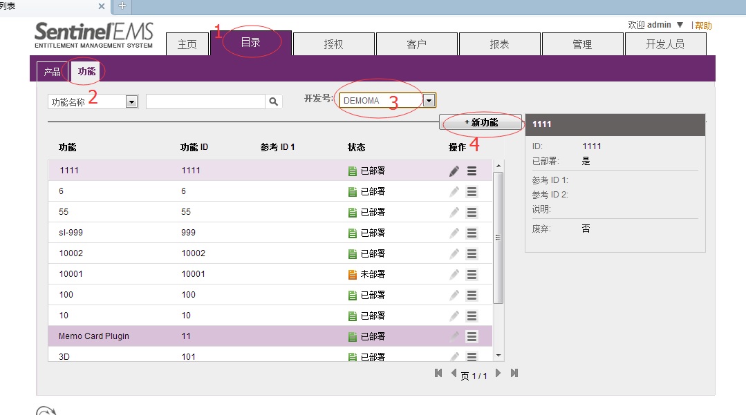 按圖中1目錄,2功能,3選擇開發(fā)號,4新建功能這樣的步驟操作