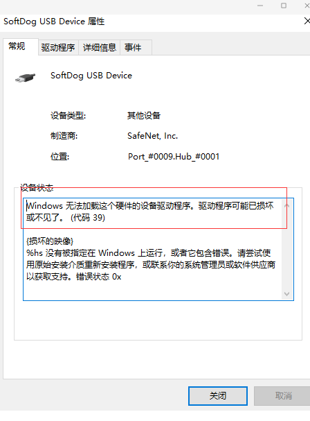 軟件狗、微狗和宏狗在win10環(huán)境中驅(qū)動安裝成功,但在設(shè)備管理器中查看帶嘆號,點擊帶嘆號的設(shè)備,詳細(xì)頁面中有39錯誤代碼,