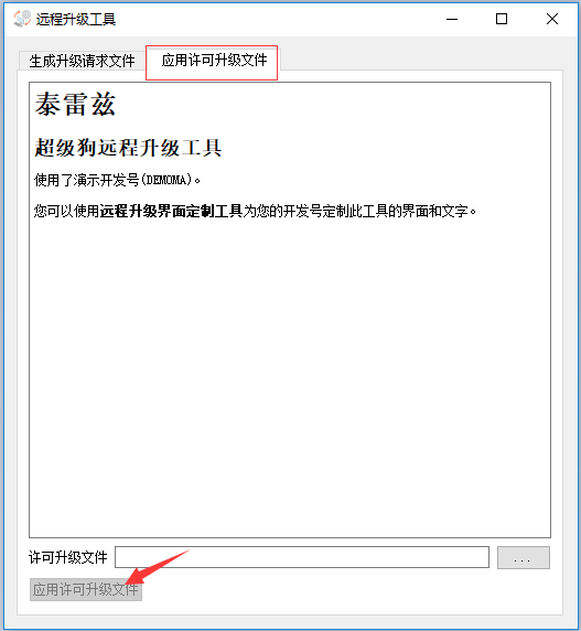 在客戶(hù)電腦上打開(kāi)之前生成的RUS軟鎖安裝工具,選擇【應(yīng)用許可升級(jí)文件】項(xiàng)