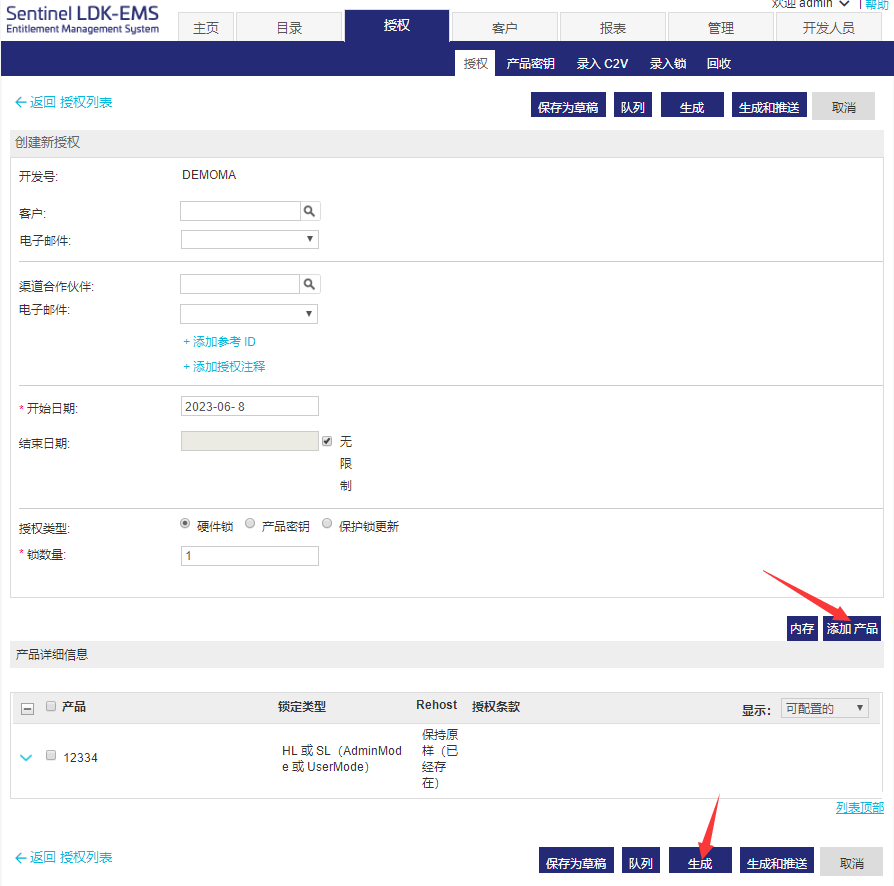 上面只需要填同一批次需要燒鎖的數(shù)量,其它可以不填,然后“添加產(chǎn)品”,把之前配置好的產(chǎn)品添進來,點“生成”鍵開始燒鎖。