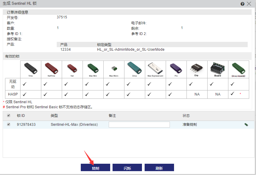 3、新建訂單、燒鎖---設(shè)置好要燒鎖的數(shù)量、對應(yīng)的軟件產(chǎn)品,開始寫鎖。