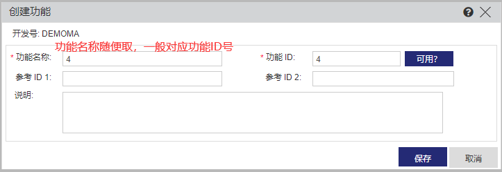 請按圖示步驟選擇1目錄,2功能,3開發(fā)號,4新建功能,其中開發(fā)號是對應(yīng)5個字母的主鎖開發(fā)號,測試用戶請選擇DEMOMA